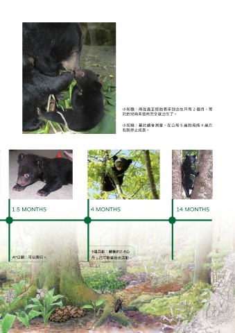 小知識:熊從真正胚胎著床到出生只有 2 個月,等 於胎兒尚未發育完全就出生了。 小知識:基於顱骨測量,在公熊 5 歲和母熊 4 歲左 右就停止成長。