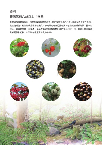 食性 臺灣黑熊八成以上「吃素」 臺灣黑熊雖屬食肉目,但野外取食以植物為主,約佔食物來源的八成,是典型的雜食性動物。 食性隨環境中植物物候呈季節性變化,春天傾向吃高粗蛋白質、低纖維的新鮮葉子;夏末和 秋天,則偏好果實。在臺灣,屬低中海拔的優勢植物組成的樟科和殼斗科,則分別成為臺灣 黑熊夏季和初秋,以及秋冬季重要的食物來源。