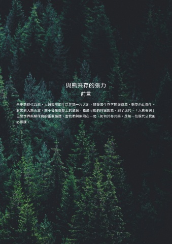 與熊共存的張力 前言 自史前時代以來,人類與熊即生活在同一片大地,競爭著生存空間與資源,衝突由此而生。 對史前人類而言,熊不僅是生存上的威脅,也是可能的狩獵對象。到了現代,「人熊衝突」 已是世界熊類保育的重要議題,當我們與熊同在一起,如何共存共榮,是每一位現代公民的 必修課。