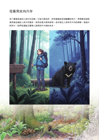 從衝突走向共存 為了實現長遠的人熊共存目標,不能只靠政府、研究機構或保育團體的努力,更需要透過教 育傳達正確的人熊共存觀念,尋求社區共識和參與,逐步建立人熊和平共存的典範。透過共 同努力,我們有望真正實現人與熊和平共榮的未來。
