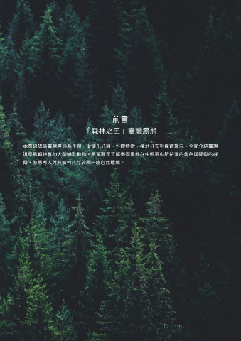 前言 「森林之王」臺灣黑熊 本區以認識臺灣黑熊為主題,從演化分類、外觀特徵、棲地分布到保育現況,全面介紹臺灣 這座島嶼特有的大型哺乳動物。希望觀眾了解臺灣黑熊在生態系中所扮演的角色與面臨的威 脅,並思考人與熊如何共存於同一座自然環境。