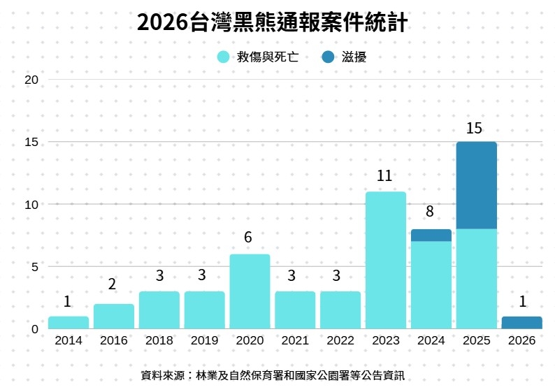 2026年,台灣黑熊通報案件總共1例,其中0例死亡、0例野放,0例收容中,而其中0例與人為狩獵活動有關,1例與人熊衝突有關。 (資料來源:林業及自然保育署和國家公園署等公告資訊)