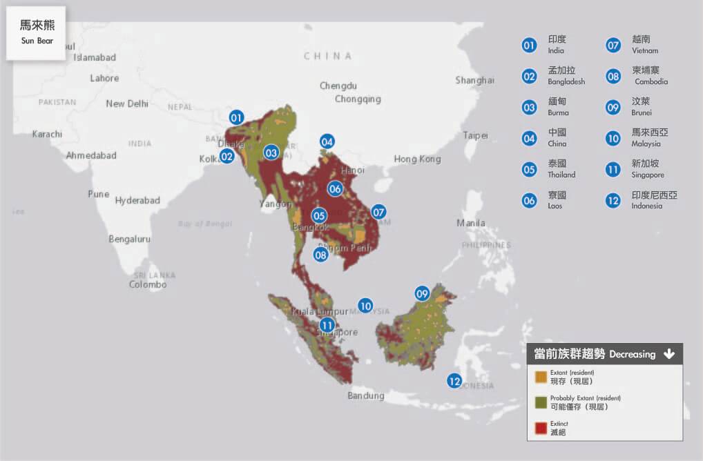 馬來熊分布於東南亞大陸塊,包括孟加拉、印度東北部、中國南部/雲南、東南亞的馬來西亞和蘇門答臘、婆羅洲。