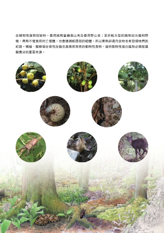 在植物性食物短缺時,臺灣黑熊會捕食山羌及臺灣野山羊;至於較大型的獵物如水鹿和野 豬,黑熊不僅食用死亡個體,也會獵捕較孱弱的個體,所以黑熊排遺內含物也有發現牠們的 紀錄。螞蟻、蜜蜂等社會性昆蟲也是黑熊常見的動物性食物,提供動物性蛋白質和必需胺基 酸養分的重要來源。