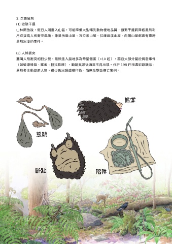 2. 次要威脅 (1) 遊憩干擾 山林開放後,假日人潮進入山區,可能降低大型哺乳動物棲地品質,頻繁干擾將降低黑熊利 用或提高人熊衝突風險,像是抱崖山屋、瓦拉米山屋、拉庫音溪山屋、向陽山屋都曾有臺灣 黑熊出沒的事件。 (2) 人熊衝突 臺灣人熊衝突相對少見,黑熊進入農地多為零星個案(<10 起),而且大部分屬於偶發事件 (如破壞蜂箱、雞舍、翻找乾糧),斷絕食源後通常不再出現。分析 198 件相遇紀錄顯示, 黑熊多主動迴避人類,僅少數出現威嚇行為,尚無攻擊致傷亡案例。
