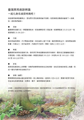 目前臺灣黑熊數量稀少,要在野外見到黑熊相當不容易,但是黑熊活動經常會留下一些痕