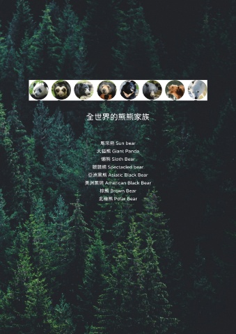 全世界的熊熊家族 馬來熊 Sun bear 大貓熊 Giant Panda 懶熊 Sloth Bear 眼鏡熊 Spectacled bear 亞洲黑熊 Asiatic Black Bear 美洲黑熊 American Black Bear 棕熊 Brown Bear 北極熊 Polar Bear